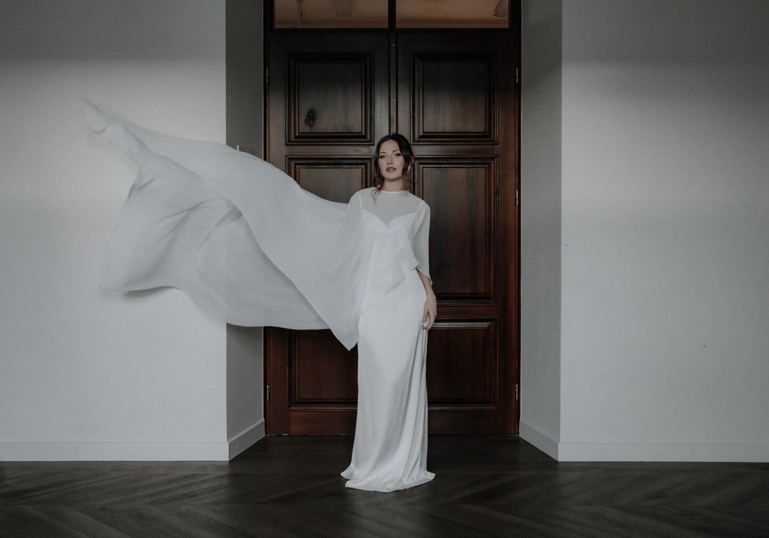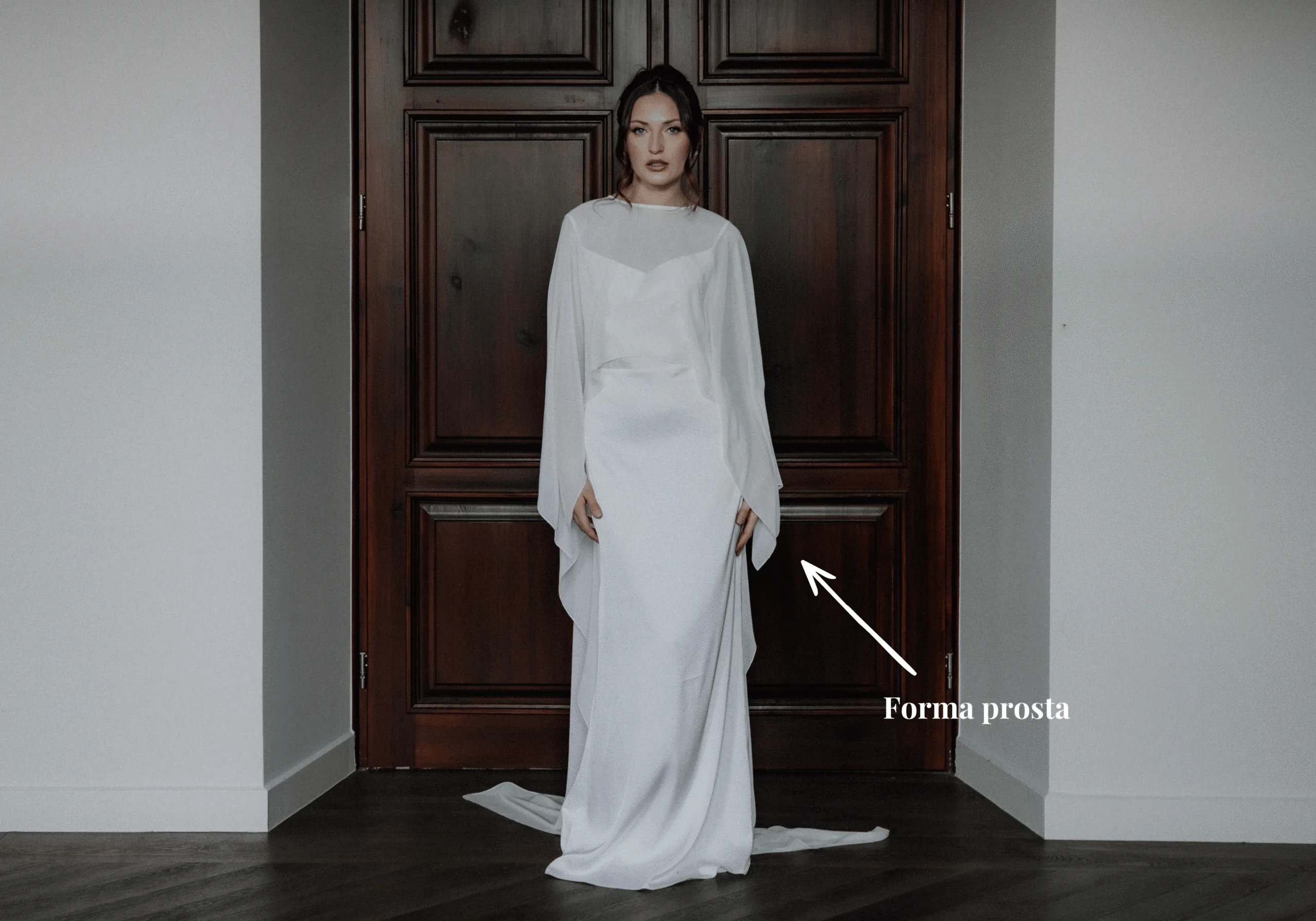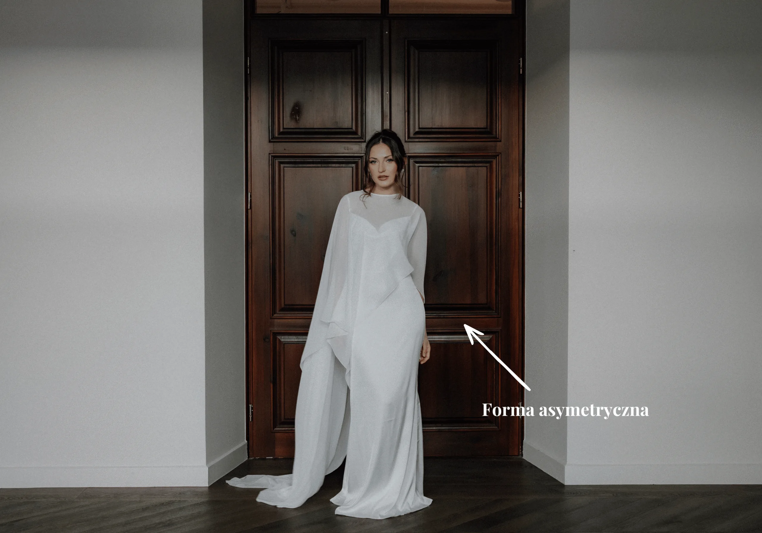 To projekt stworzony dla panny młodej, która szuka nowoczesnej alternatywy dla klasycznego welonu i ceni geometryczne, plastyczne formy. Narzutka stanowi lekką, transparentną warstwę, która całkowicie odmienia charakter prostej sukni, nie zasłaniając jej konstrukcji.
