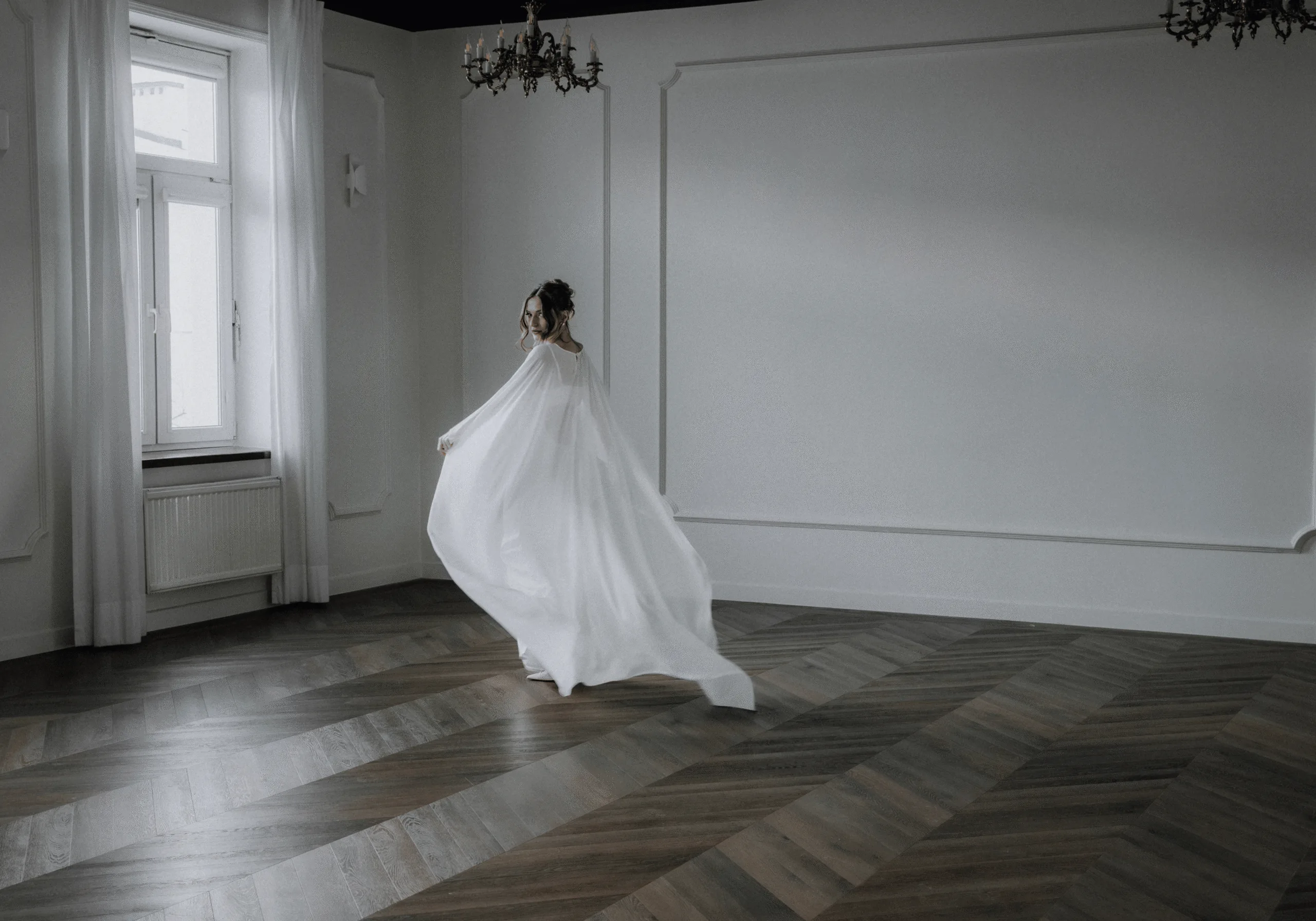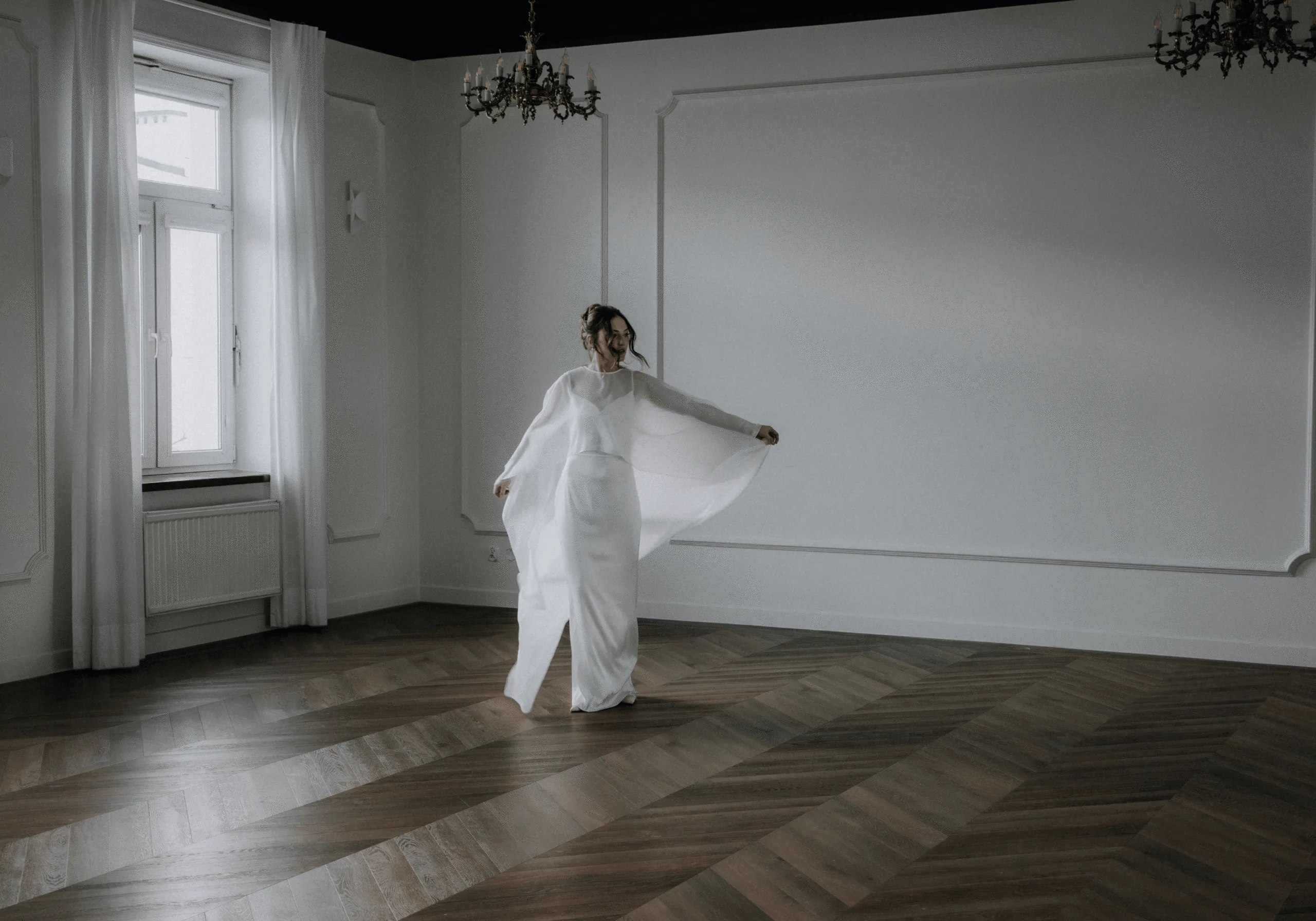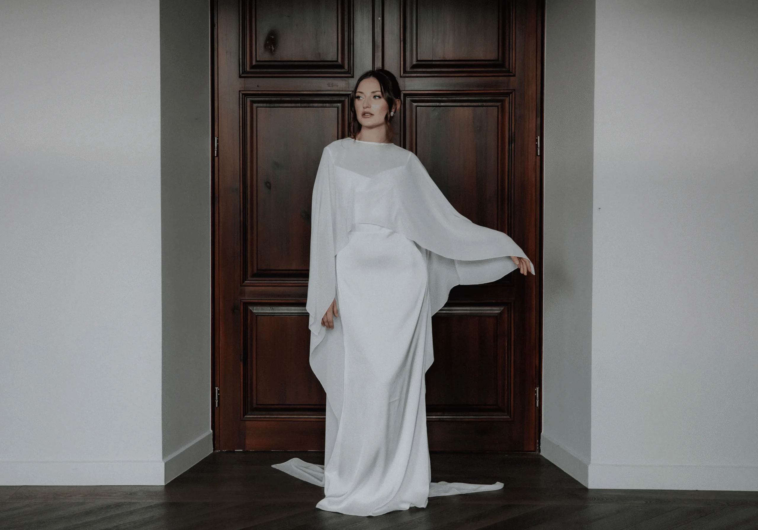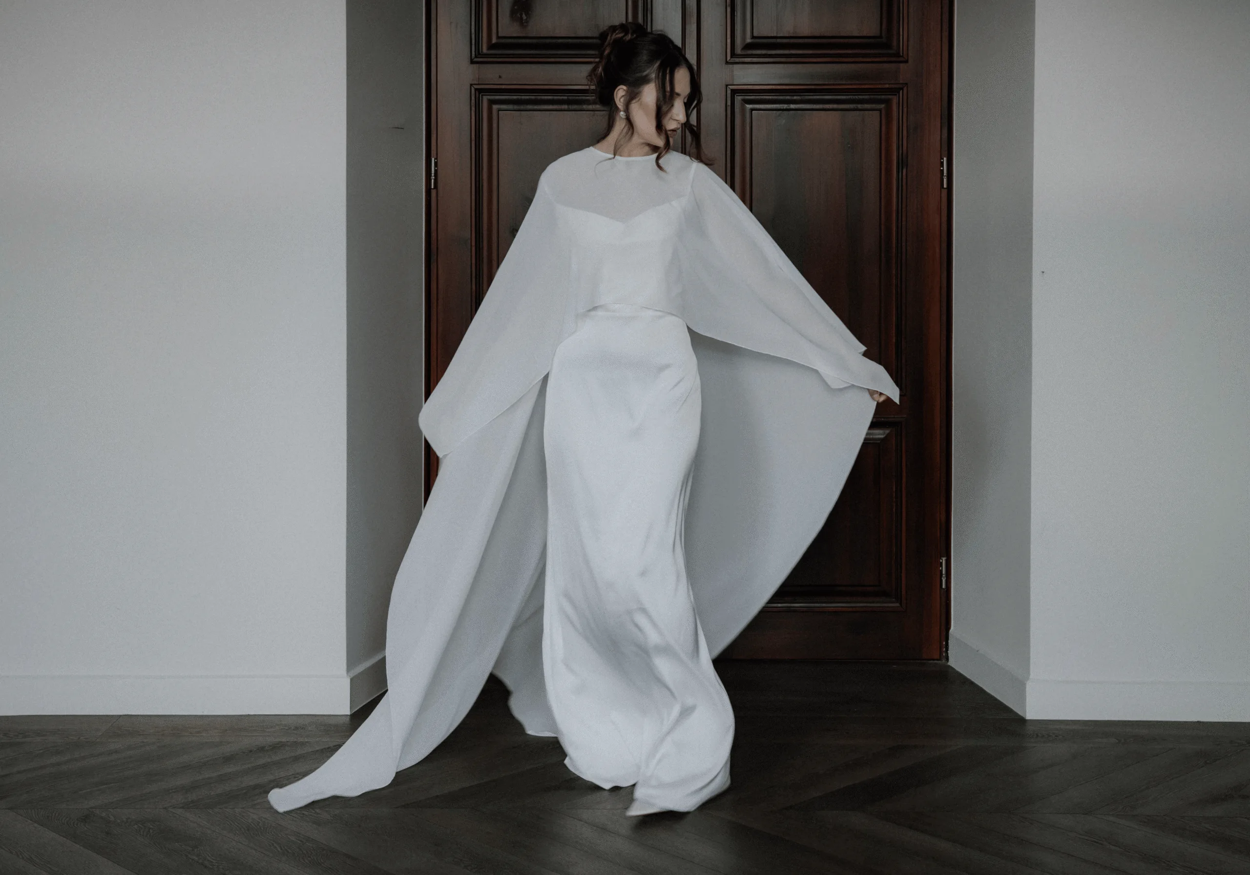 To projekt stworzony dla panny młodej, która szuka nowoczesnej alternatywy dla klasycznego welonu i ceni geometryczne, plastyczne formy. Narzutka stanowi lekką, transparentną warstwę, która całkowicie odmienia charakter prostej sukni, nie zasłaniając jej konstrukcji.